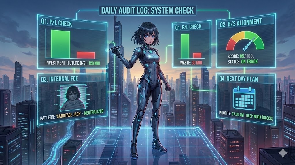 - [ ] 【日次決算の予約】 スマホのリマインダーをセットする。毎日22時に「日次監査」というタイトルで通知が来るようにし、4つの質問に答える体制を作る。