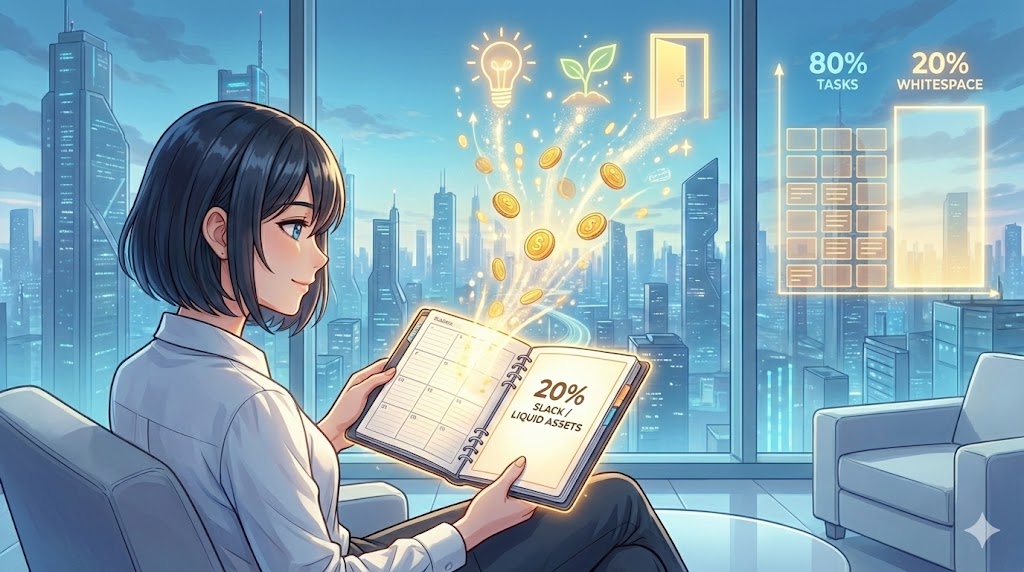 工場の稼働率を100%にすると、機械の故障リスクが高まり、ボトルネックが発生した際に全ラインが止まります。同様に、あなたのスケジュールも常に「20%の空き地」を確保しておく必要があります。この20%は、決して「ダラダラする時間」ではありません。これは「戦略的予備費」であり、投資の種銭(シードマネー)です。