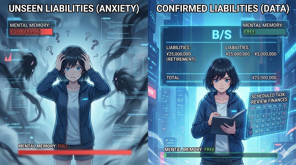 「将来のお金が不安」という状態は、B/Sの右側に、いつ、いくら爆発するか分からない「巨大な偶発債務(見えない借金)」がぽっかりと口を開けている状態です。