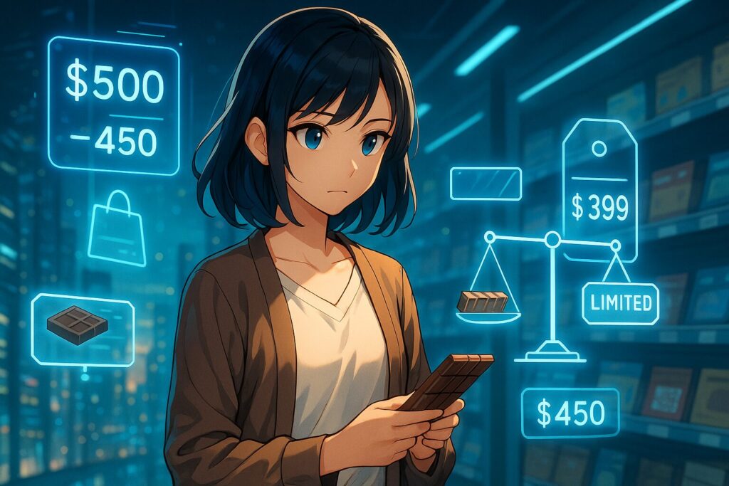 「産地限定カカオ」「イベント限定パッケージ」など、直接の値下げではなく“違う価値”に切り替える。基準の比較先をずらすので、古い見慣れ価格(アンカー)との直接対決を避けやすい。これは“同じ板チョコ”でも、感じる基準をリセットする狙いがあるわけです。(行動経済学では、比較の枠組みが変わると評価も変わる、という典型パターン。)