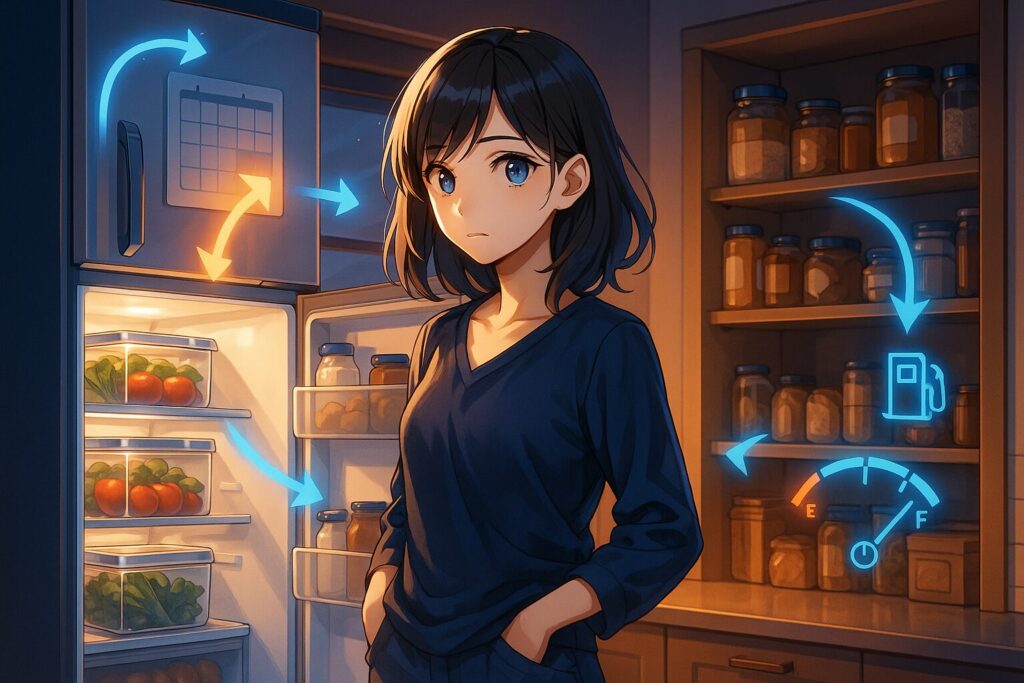 値段は、見出しの翌日に一斉に跳ねるわけじゃない。会社の在庫が入れ替わり、卸→小売へ順に伝わって、ようやくレジに届く。ここに時間差(タイムラグ)がある。ならば家計側も、同じ発想で守りを固めればいい。キーワードは在庫回転。むずかしく聞こえるけど、やることは簡単で「どれだけ持っていて、何日で使い切るか」を把握するだけ。冷蔵庫・パントリー・ガソリンタンクの“滞在時間”を短く整えると、ニュースに振り回されにくくなる。