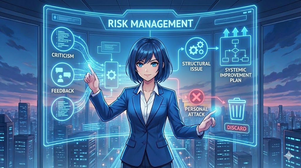 一方、批判を「リスク情報」として計上すると、改善の原資になります。リスクマネジメントの基本は「リスクを可視化し、コントロール可能な状態に置く」こと。批判は、組織のリスクを無料で教えてくれるセンサーです。