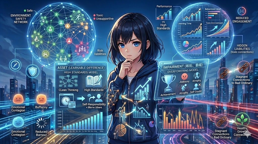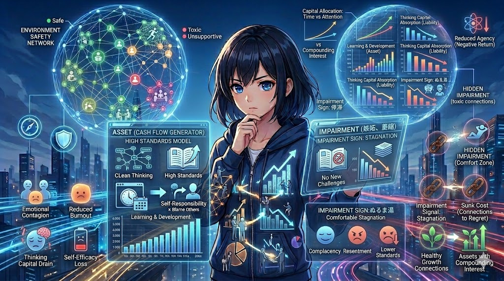 投資の世界では、何にお金を置くかで未来のリターンが変わる。会計の世界では、どこに資産を計上し、どこで減損を認識するかで、会社の実態の見え方が変わる。人間関係も同じです。誰と長く時間を過ごすかは、毎日の思考、行動、基準値に影響する。つまり、人生のP/LにもB/Sにも、じわじわ効いてくる。