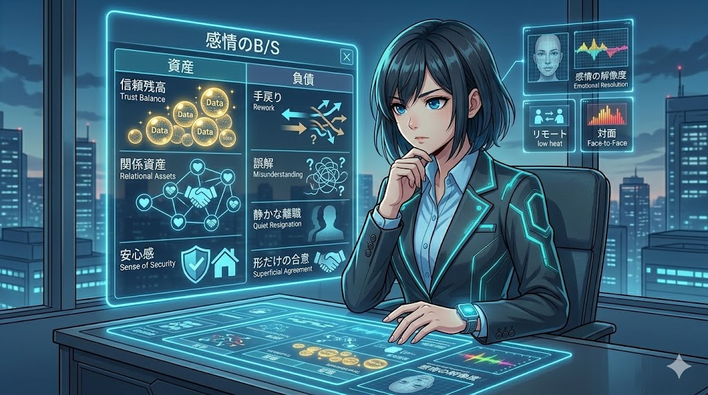 20代、30代の社会人にとって、この視点は地味に効きます。仕事ができる人ほど、タスク管理や資料作成の技術は磨く。でも、その一段奥にある「人の感情が動く設計」まで見ている人は少ない。ここを理解すると、会議の組み方、1on1の使い方、出社の意味、出張の意味まで変わります。P/Lだけを見て移動時間をコスト扱いする人と、B/Sに乗らない信頼残高まで見て動く人では、同じ1時間の価値がまるで違う。今日はそこを、投資と会計のレンズで深掘りします。