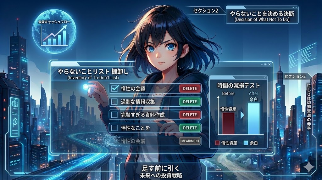 昔は意味があったけれど、今は惰性になっている仕事。誰も読んでいない資料。安心のためだけに続いている確認。やめると一瞬ざわつくが、実はなくても回る会議。これらは、時間の帳簿に残り続ける古い資産だ。