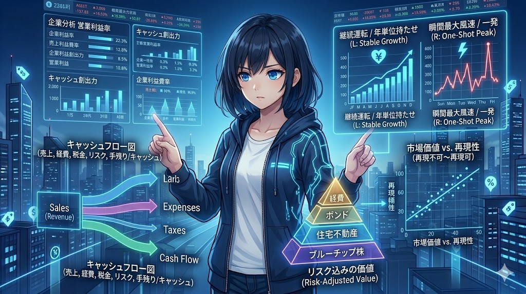 SNSの炎上の見え方も変わるし、派手な成功話を見たときの距離感も変わる。自分の給料を必要以上に恥じなくて済むし、逆に、誰かの大きな売上や高収入を見ても、雑に否定しなくて済む。投資の目線で言えば、数字のインパクトに飲まれず、継続性と再現性を見る癖がつく。会計の目線で言えば、売上、粗利、キャッシュ、税金、リスク、耐用年数を分けて考えられるようになる。ここが身につくと強い。派手な数字に振り回されにくくなるからだ。