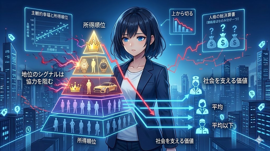 2026年のNature Communicationsの研究では、109カ国・9万人超のデータから、多くの国で人の主観的幸福は、絶対的な所得額よりも、その社会の中で自分がどの位置にいるかという「所得順位」とより強く結びついていた。これ、かなり重い話だ。