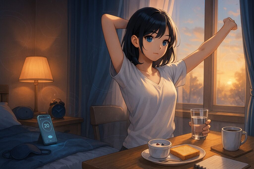 前夜の撤収時刻と光、当朝の光・水・軽食・短仮眠、そして1杯+90分の短期決戦。たったこれだけで、眠気コストは“管理可能な変動費”に変わります。雰囲気に連れていかれる朝から、自分で利益を取りに行く朝へ。リズムが整い始めると、「1本仕上げてから出社」がふつうになる。そこで毎日少しずつ、未来の配当が積み上がります。