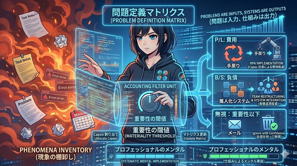 実務においては、このプロセスを属人化させないために、Excelやスプレッドシートで「現象リスト」「影響額・時間(P/L・B/S)」「重要性判定(○×)」「対応方針」を可視化した『問題定義マトリクス(テンプレ)』を作成し、チームの共通言語にしてください(本記事の末尾にテンプレートの構成案を同梱しています)。