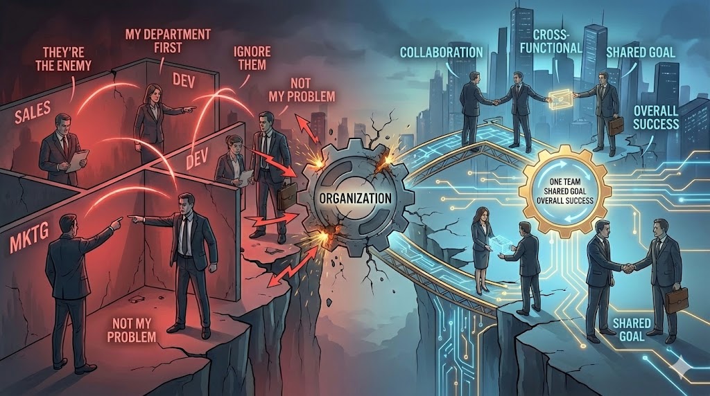 部門ごとの目標が、他部門の利益と相反するように設計されていれば、社員は合理的に「他部門を攻撃し、自部門を守る」ようになります。