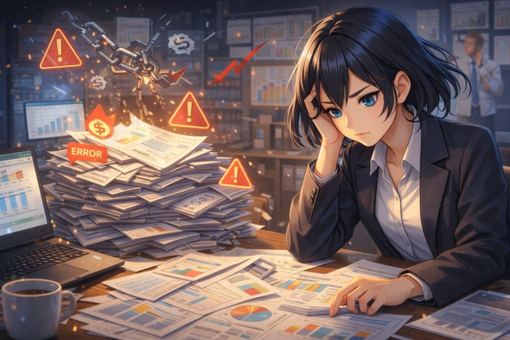 加えて、属人化やヒューマンエラーのリスクは、経営コストに跳ね返ります。大量データの目視集計ミスや転記ミスは頻発し、人手での修正・再提出に膨大な時間を取られます。また、担当者が異動・退職すると、そのExcelファイルはブラックボックス化し、引継ぎに膨大な手間とコストがかかるのも周知の課題。これらは全て、企業に見えないコストとして積み重なり、意図せぬ在庫となって経営を圧迫します。