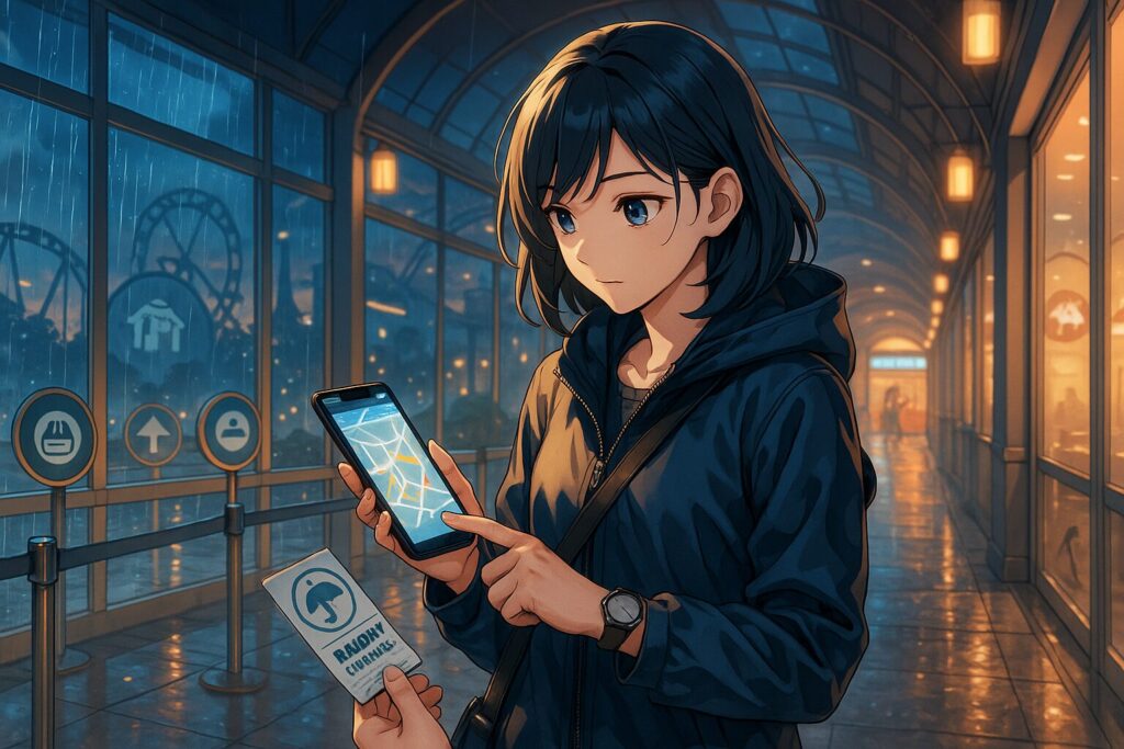 近年は「レイニーデー保証(一定以上の降雨で再入園可)」のような制度を打ち出すパークもあります。こうした制度がある日は、“もし止まってしまっても損しにくい”。当日の告知や公式サイト、現地掲示をチェックしておくと意思決定が楽です。さらに、屋内ショー/シアター/展示を“代替案フォルダ”として3〜5個ストック。屋外パレード中止の告知が出たら、即座にフォルダから次善手を選びます。