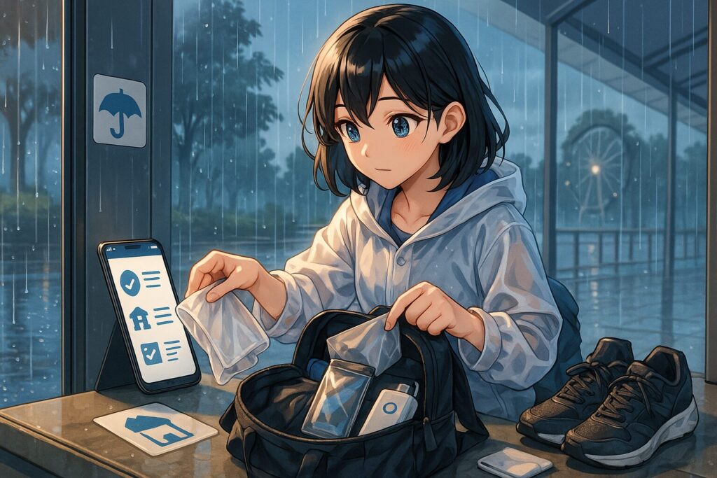 - 家に“雨用セット”を常備:100均カッパ、防水スニーカー(防水スプレーでも可)、キャップ、タオル、替えソックス、スマホ用ジップロック。初期投資は小さく、準備時間はゼロに近づきます。