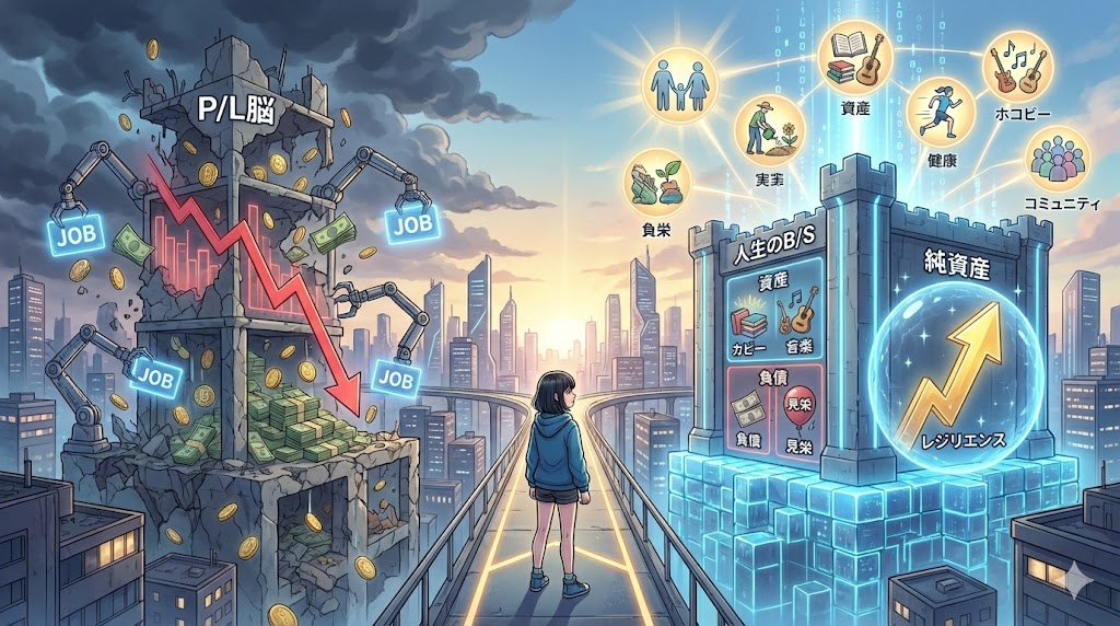 自分の価値を「給料(P/L)」だけで測るのは限界です。AI時代を生き抜くためには、仕事以外の「役割・意味・関係性」という無形資産をB/Sに計上し、人生のポートフォリオを分散させる必要があります。